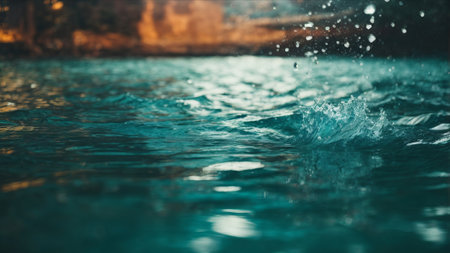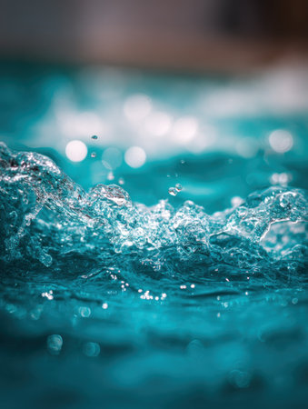 Close-up of turquoise water with splashes, ripples, and bokeh in the background