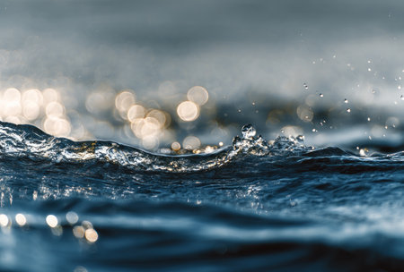 Captivating close-up of water waves featuring vibrant droplets and a serene sunset. Perfect for nature lovers and serene backgrounds.