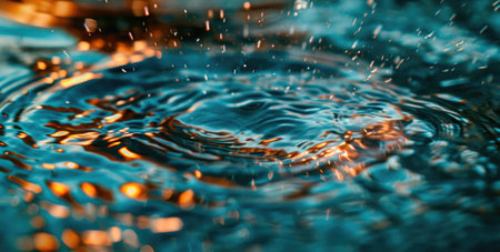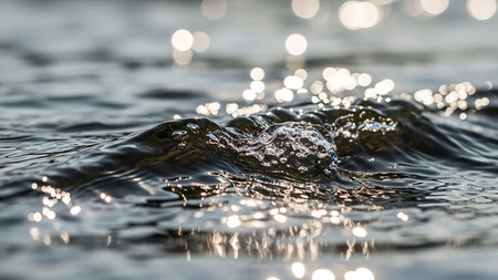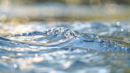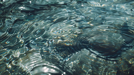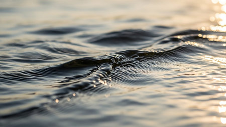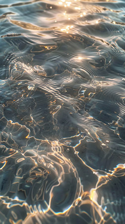 Capturing exquisite patterns of illuminated ripples dancing across the surface, this close-up reveals nature's artistry. Soft light interacts with water, creating enchanting reflections and depth.