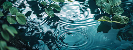 Green leaves floating on the calm rippled surface of water, creating a tranquil and serene natural scene. Reflections and light play on the water enhance the peaceful ambiance.