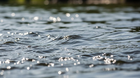 Discover a serene water surface adorned with gentle ripples and vibrant light reflections, ideal for evoking tranquility and natural beauty in imagery.