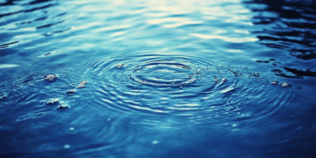 A single water droplet falling into the calm blue waters, creating ripples that spread out in an elegant pattern, symbolizing tranquility and reflection. The background is plain with no other elements to pepper it or appear on top of the surface, focusing all attention only on the drop's impact and its harmonious flow through the stillness of nature. --ar 53:30 --v 6.1 Job ID: ece52af9-f085-480e-bfe7-dfecfb3ca3e2