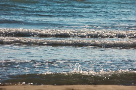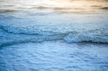 Waves breaking on the beach at sunset. Natural background with copy space