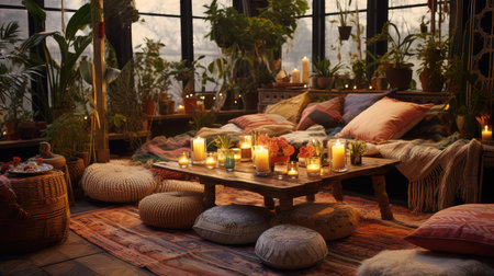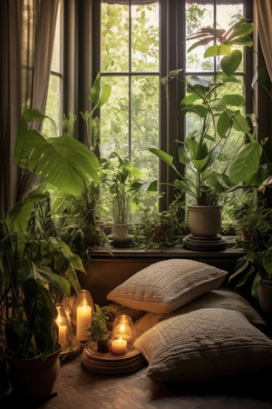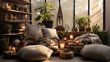 peaceful meditation corner with cushions, plants, and soft lighting, created with generative ai