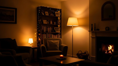A warm and inviting living room scene featuring a comfortable armchair, a crackling fireplace, and a steaming coffee cup on a wooden table, surrounded by books and soft lighting.
