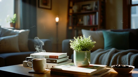 A warm and inviting living room scene featuring a coffee table with a steaming cup of coffee, books, and glasses, set against a blurred background with a fireplace, couch, and plants.
