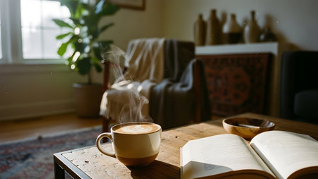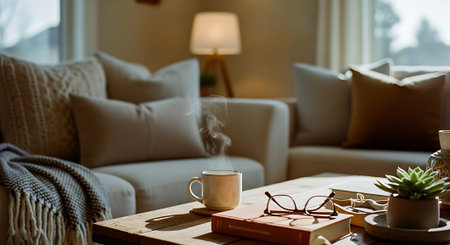 A warm and inviting living room scene featuring a steaming cup of coffee on a wooden table, accompanied by a succulent plant and books, with a comfortable armchair and sofa in the background.
