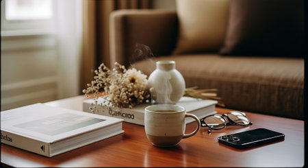 A serene living room scene with a coffee cup, books, glasses, a small plant, and a candle on a wooden table. A comfortable sofa and artwork in the background.