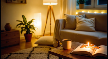 A serene living room with a warm glow, featuring a comfortable couch, a wooden coffee table with a lit candle and a cup of coffee, and a potted plant in the background.