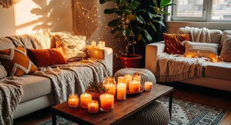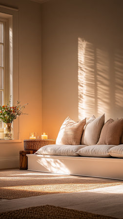 A warm and inviting living room features a comfortable couch adorned with soft cushions, illuminated by gentle sunlight. Candles and a flower vase enhance the peaceful atmosphere.