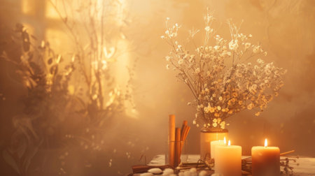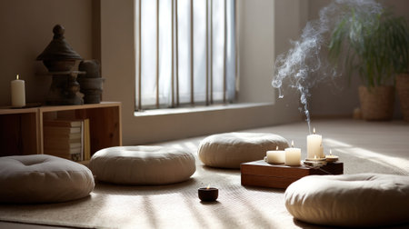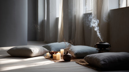 A tranquil scene of a meditation space featuring soft cushions flickering candles and delicate wisps of incense smoke curling towards the ceiling in a warmly lit room