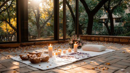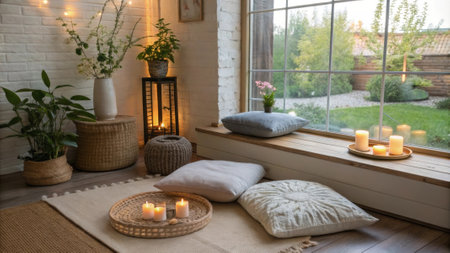 meditation space near the window with candles and soft pillow. for daily relaxation