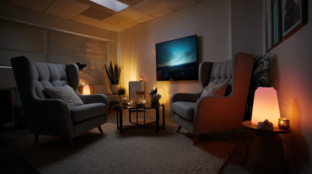 A serene living room setting featuring a comfortable armchair, a side table with books and a plant, and a lamp providing warm lighting, creating a relaxing atmosphere.