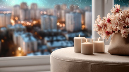 Unwind with tranquil sophistication This serene living room, bathed in candlelight and soft textures, offers a calming escape Evoking a sense of calm, it represents the focus and clarity of a digital marketing expert leveraging AI Ideal for branding, relaxation, home decor inspiration, or crafting inviting marketing visuals AI Generative