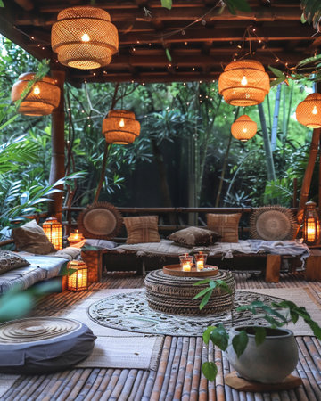 Cozy summer evening gathering with natural materials, including bamboo lanterns, wicker furniture, and soft lighting