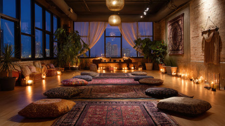 This tranquil yoga studio features cozy seating and soft ambient lighting, perfect for relaxation and meditation in a serene urban setting.
