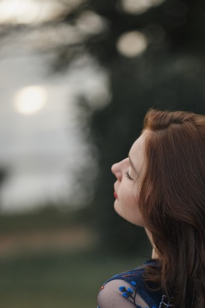 A woman stands outside with her eyes closed and a slight smile on her face. She seems to be enjoying the fresh air and sunlight in a natural setting. Her hair flows in the wind.
