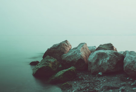 A cluster of mossy, rough stones sits at the edge of tranquil water, fading into a hazy sky