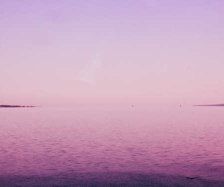 With showing serene ocean horizon at sunrise with soft pastel pink and blue sky reflecting on calm water surface. resolution