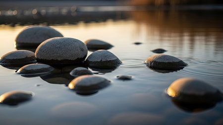 Close-up of rounded stones partially submerged in calm water, reflecting a soft, warm light. The image displays a natural, serene environment with blurred reflections. It presents a tranquil setting likely outdoors during daylight, suitable for various editorial and commercial applications. The composition emphasizes texture and natural beauty.