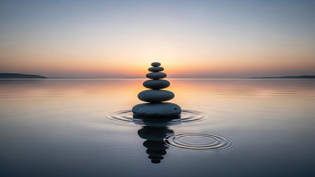 A balanced stack of dark stones rises from still water, creating concentric circles. The scene is bathed in the warm light of a setting sun, reflected on the water's surface. The smooth texture of the stones contrasts with the soft, diffused light, suggesting a tranquil outdoor setting suitable for various editorial and commercial applications.