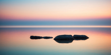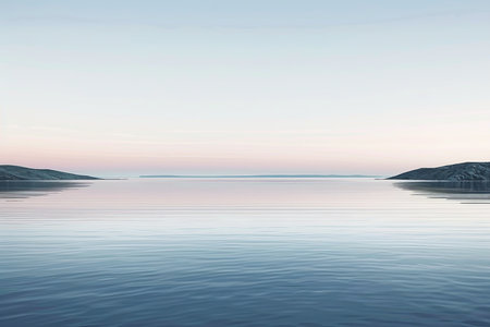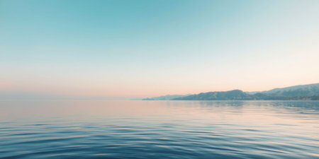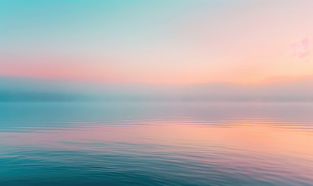 Experience a tranquil moment with calm ocean waters reflecting a soft pastel sky at sunset, creating a beautiful and serene coastal landscape.