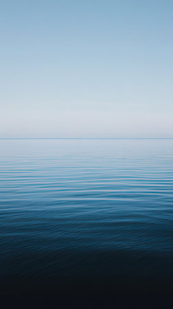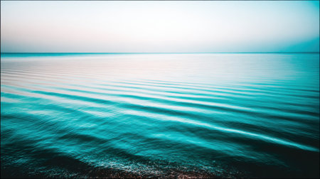A serene and minimalist seascape featuring vibrant blue and turquoise water with a motion blur effect. The soft horizon blends into a light sky, creating a peaceful and tranquil mood.