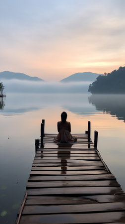 A person sits on a wooden pier, facing a calm lake at dawn, embodying peace and mindfulness. The misty atmosphere enhances the sense of solitude and reflection.