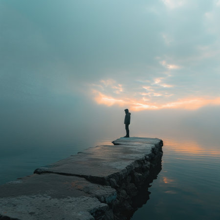 A lone figure stands on a pathway extending into a calm body of water. The image presents a serene composition with a soft color palette. The sky and water reflect the warm hues of a sunset. This could be suitable for projects related to concepts such as peace, reflection, or travel.