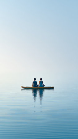Two people are practicing yoga and meditating on a paddle board, enjoying the tranquility of sunrise on calm water, creating a serene and peaceful atmosphere