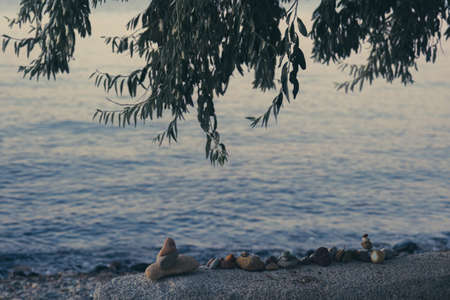 A closeup shot of perfectly balanced different sized rocks at the coast of the sea - perfect for stability depiction articles
