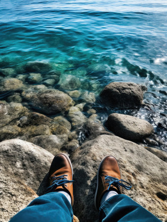 The image shows a persons legs and feet wearing blue jeans and brown shoes, sitting on a rocky shore near a clear, blue body of water with visible rocks beneath the surface. The rocks and water create a serene and natural atmosphere.