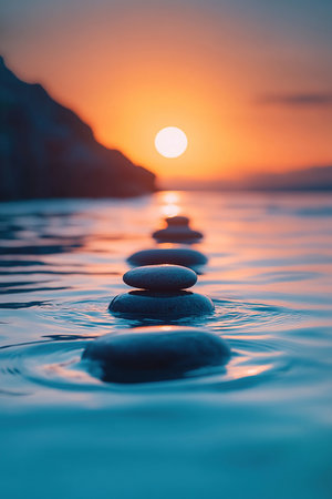 Photo of balanced stones in the sea at sunset, symbolizing harmony and balance for meditation or spa