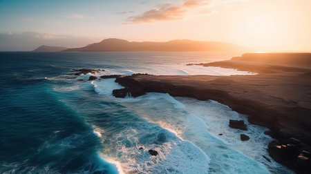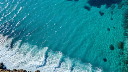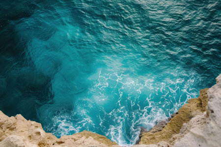A Majestic View of the Pacific Ocean From a Cliff, Elevated perspective of a serene sea lapping against the harsh rock bed, AI Generated