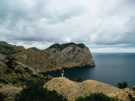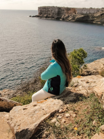 Woman sitting on rocky cliff overlooking the ocean on a sunny day, latin woman looking out over the mediterranean sea cliffs, in mallorca balearic islands spain