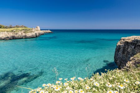 Archaeological site and tourist resort of Roca Vecchia, Puglia, Salento, Italy. Turquoise sea, clear blue sky, rocks, sun, in summer. The sixteenth-century lookout tower. Daisies in the foreground.