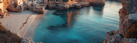 The beauty of a secluded beach unfolds at sunset, with vibrant colors reflecting on the calm waters, surrounded by rugged cliffs and charming coastal buildings.