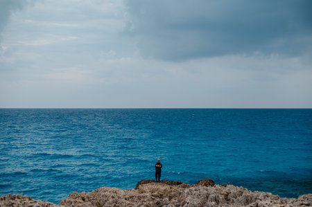A lone person stands on rocky cliffs overlooking a vast, calm ocean under a cloudy sky.