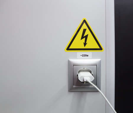 Close-up electrical socket and a plug on the wall.