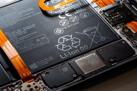 Dissasembled tablet, electronic circuit board, close-up of connectors and chips, science and technology background