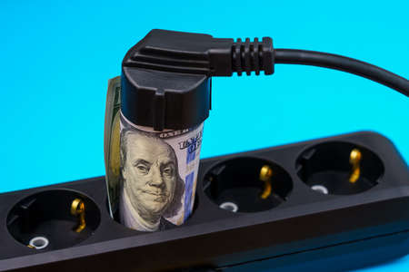 Rolled dollar bills in power strip sockets. The concept of the energy crisis and electricity inflation. Rising electricity prices. Copy space for text.