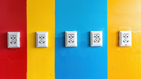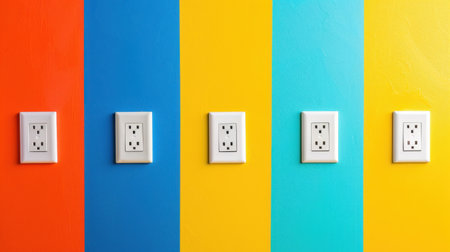 This image features colorful wall outlets set against vibrant backgrounds, capturing the essence of modern design and lively interior decor. The bright colors add a unique flair to any space, highlighting both practicality and aesthetic appeal.