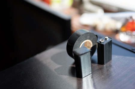 9 volt dead battery with terminals covered with electrical tape for safety