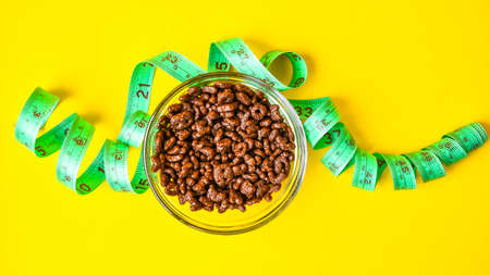 Bowl with chocolate corn flakes. green centimeter tape, healthy eating, diet, quick breakfast
