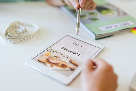 Close-up of the diet application with the meals on a tablet