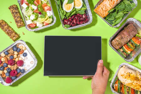 Healthy catering menu, courier food delivery lunch boxes. Beef steak meat, chicken filet, fish and vegetables in packages. Daily meal diet plan delivery, take away containers, online order concept