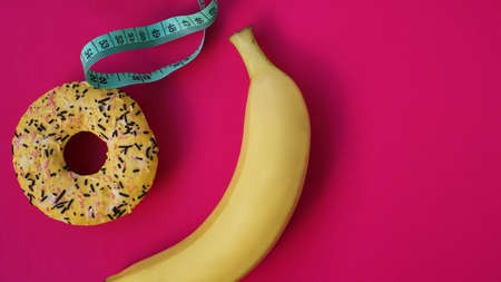 Two types of food, healthy and unhealthy, banana and donut, diet and obesity, health concept on a pink background