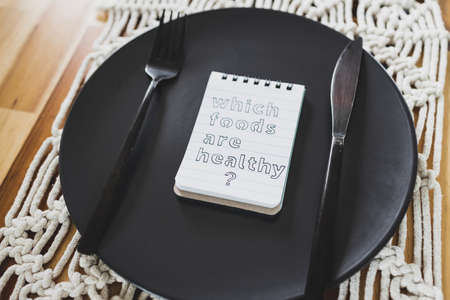 Which foods are healthy text on dining plate with fork and knife, concept of dieting vs healthy nutrition and intuitive eating