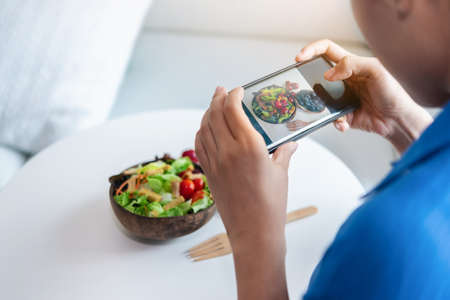 A woman is using smartphones to take photos to post a salad she made in her social.