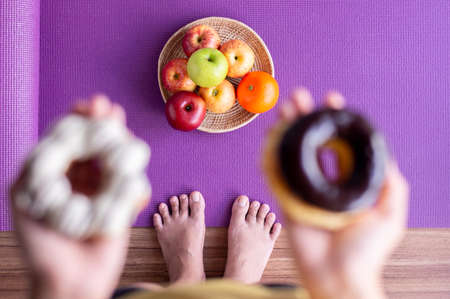 Fat woman choosing between junk food and fruits